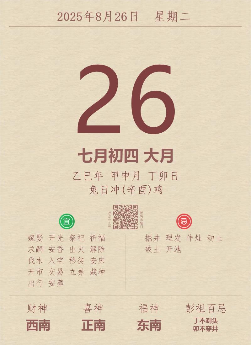 时宜:祈福 求嗣 纳采 嫁娶 出行 求财 开市 交易 安床 赴任