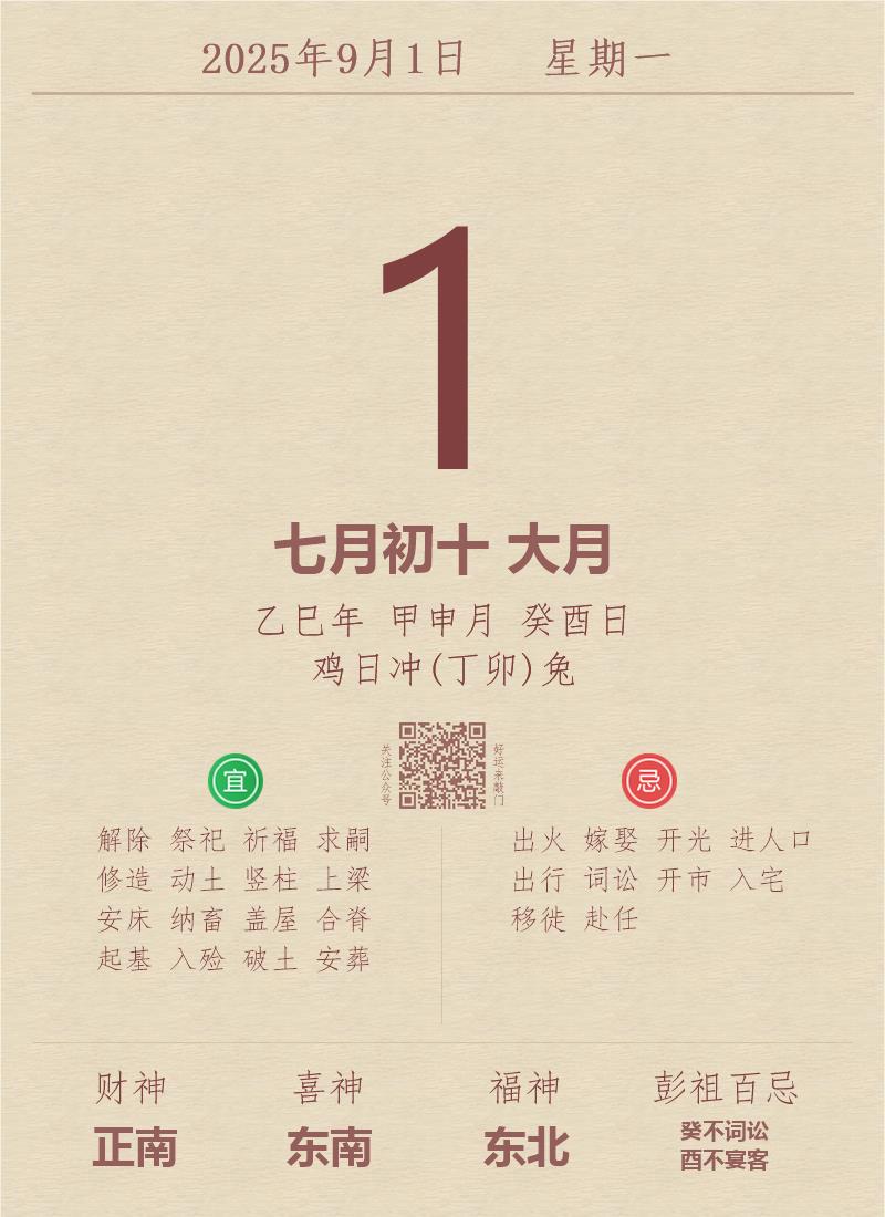 时宜:祭祀 祈福 斋醮 酬神 修造 作灶 见贵 求财 嫁娶 认养 移徙 安葬