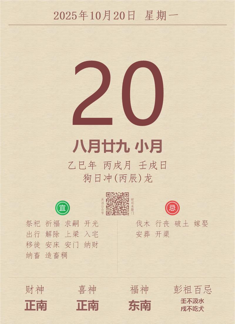 时宜:开市 入宅 修造 移徙 安床 作灶 祭祀 祈福 求嗣 嫁娶 出行 安葬 赴任 求财 见贵