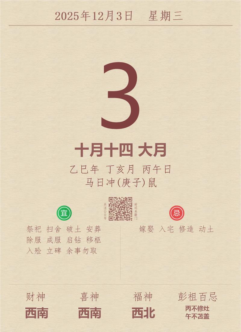 时宜:开市 入宅 修造 移徙 安床 作灶 祈福 求嗣 嫁娶 出行 安葬 赴任 求财 祭祀 交易