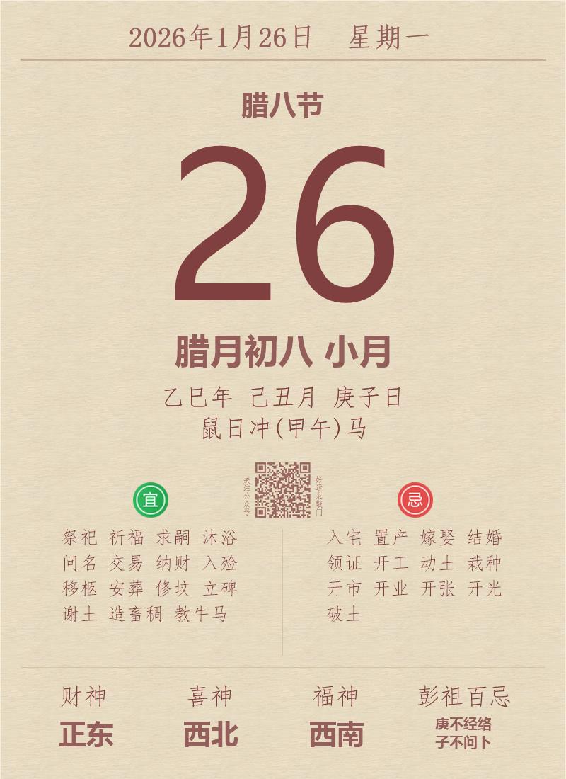 时宜:祈福 嫁娶 修造 入宅 安床 移徙 安葬 求嗣 祭祀 出行 开市