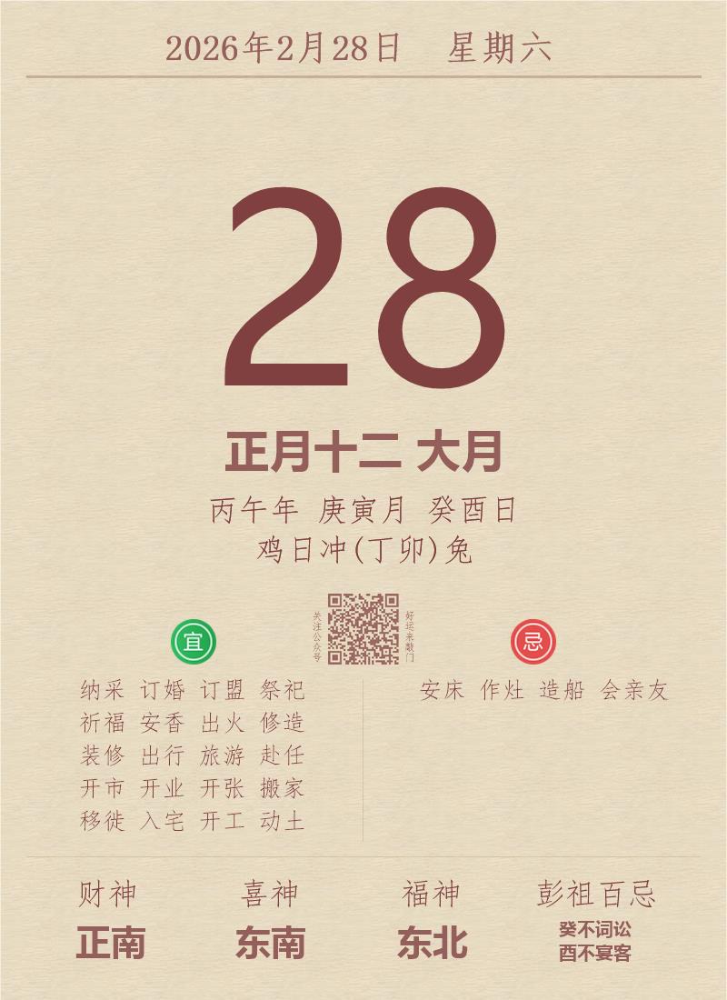 时宜:祈福 求嗣 纳采 嫁娶 出行 求财 开市 交易 安床 祭祀