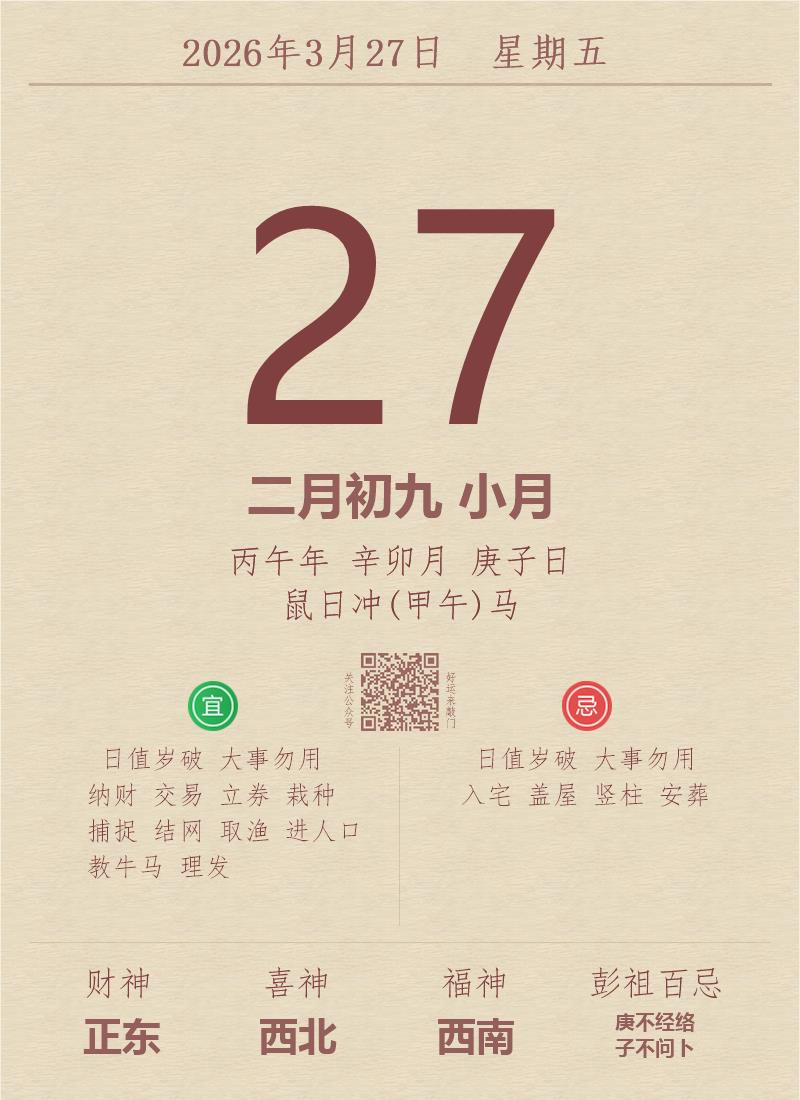 时宜:祭祀 祈福 酬神 出行 求财 见贵 纳采 嫁娶 修造 安葬