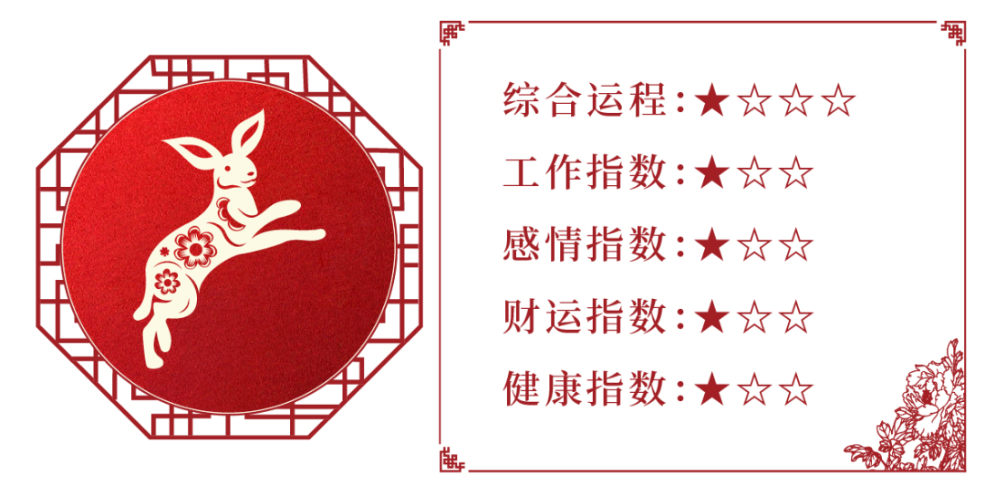本月逢“六害劫星,”对于生肖兔的朋友来讲,属于一个劫数的月份,凡事难以顺心,容易遭受小人迫害、嫉妒、捣乱,是非临身。平时谋事需谨慎,注意自身言行,凡事最好以稳为主,不可强求。
