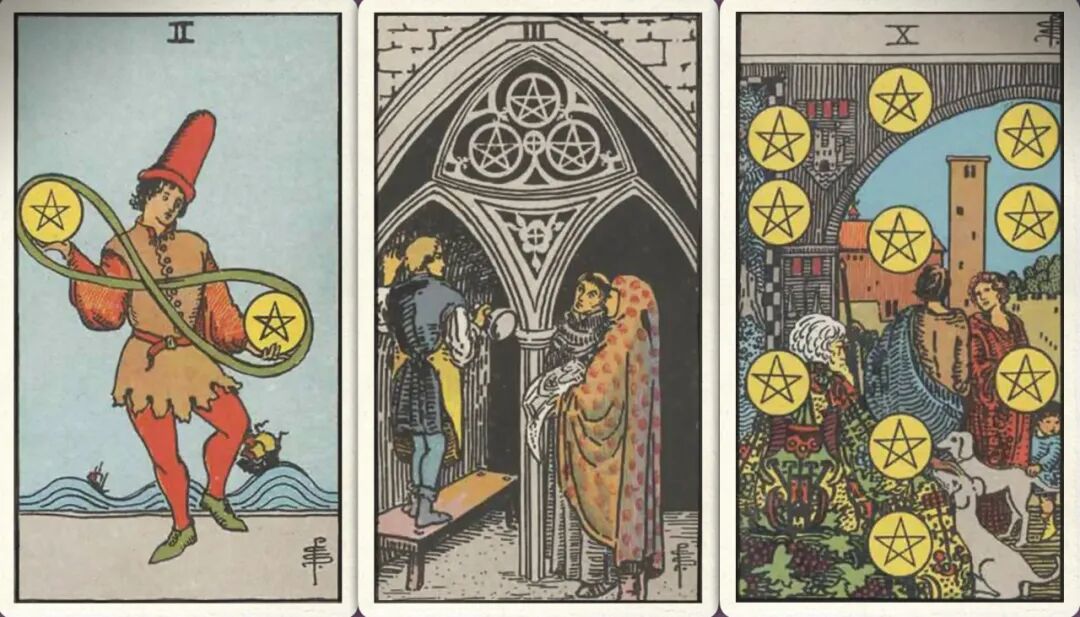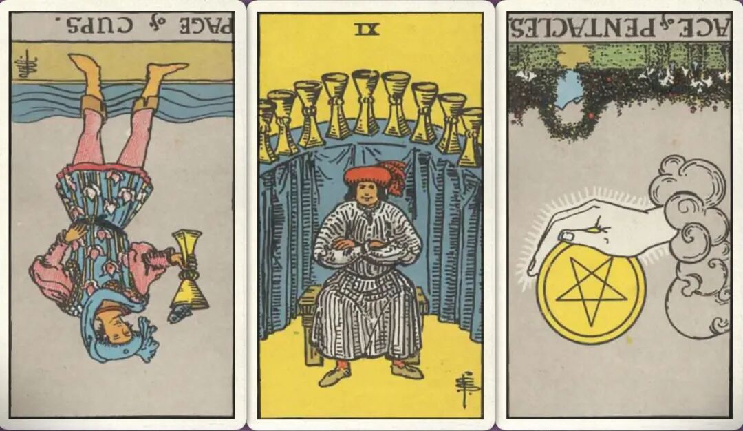 牌:圣杯侍从- 圣杯九+ 星币ace-