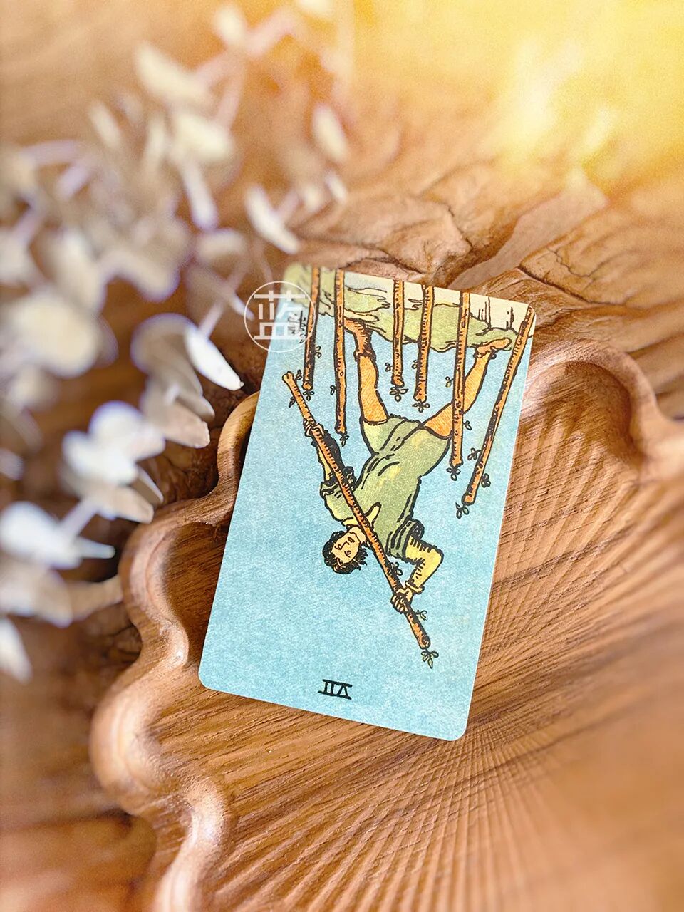 权杖7象征着博弈,这种博弈的对峙既有外在因素的困扰,也有内在因素的挣扎,总的来说还算是积极乐观的状态。但逆位的权杖7则暗示着信心的崩塌,导致你可能无力或无心去抗争些什么。当然,这并不是说就一定是坏事,从生活的角度来说,安稳或许更重要,又或者也是一种解脱,可以更好地回归自己的生活。
