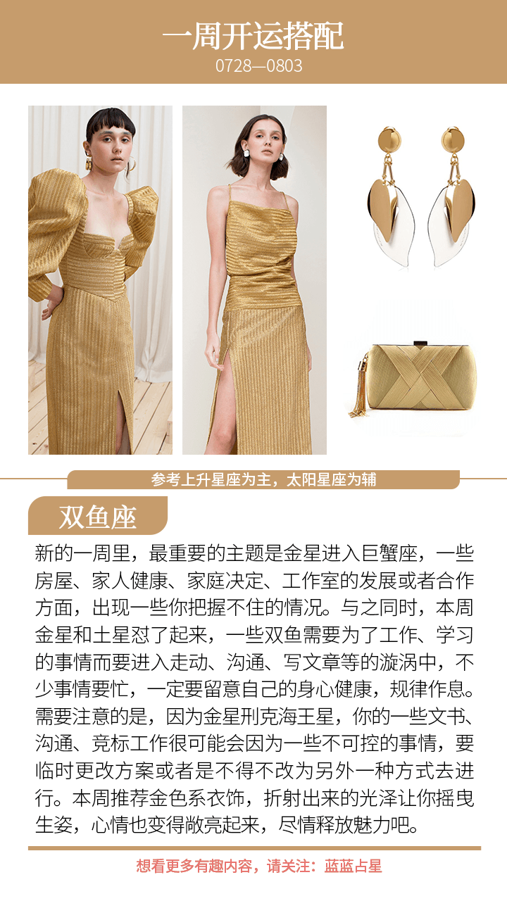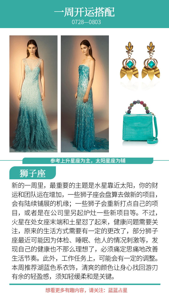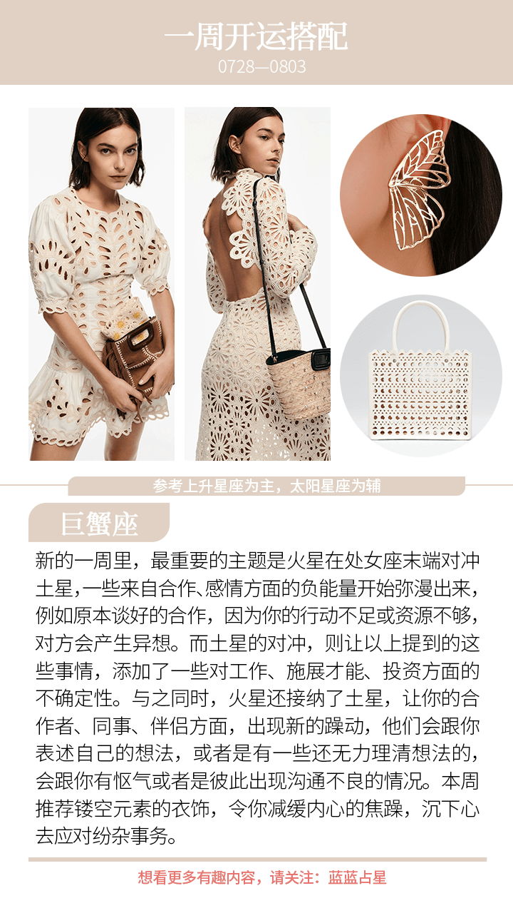 而对于(上升星座或太阳星座)狮子、巨蟹、金牛、天秤来说,你的合作者或者伴侣、恋人会出现额外需要你的情况,或者是他们出现情绪无常的情况,本周尽量独善其身,做好自己能做的,莫管太多他人是非和想法。