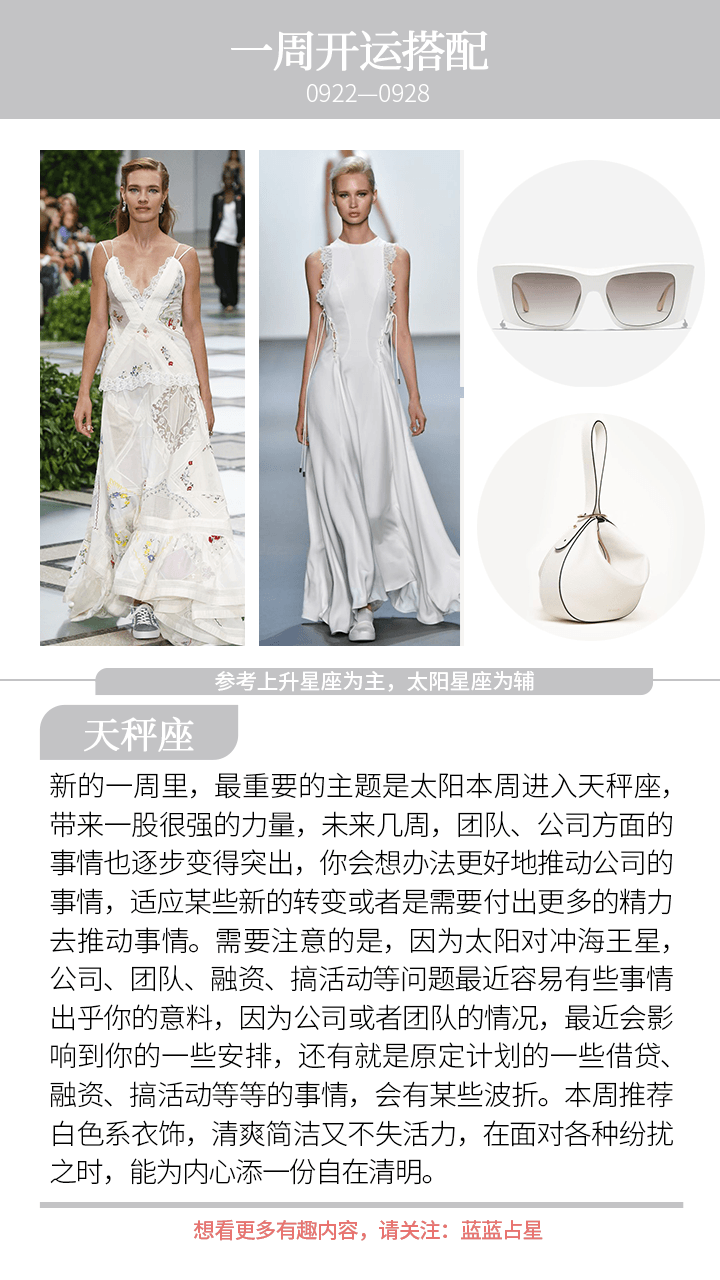 此外,太阳本周要进入天秤座了,9月23日2:19太阳走到黄道的180度,这也是二十四节气中的秋分,随着太阳的进驻,天秤月也将正式拉开序幕。
