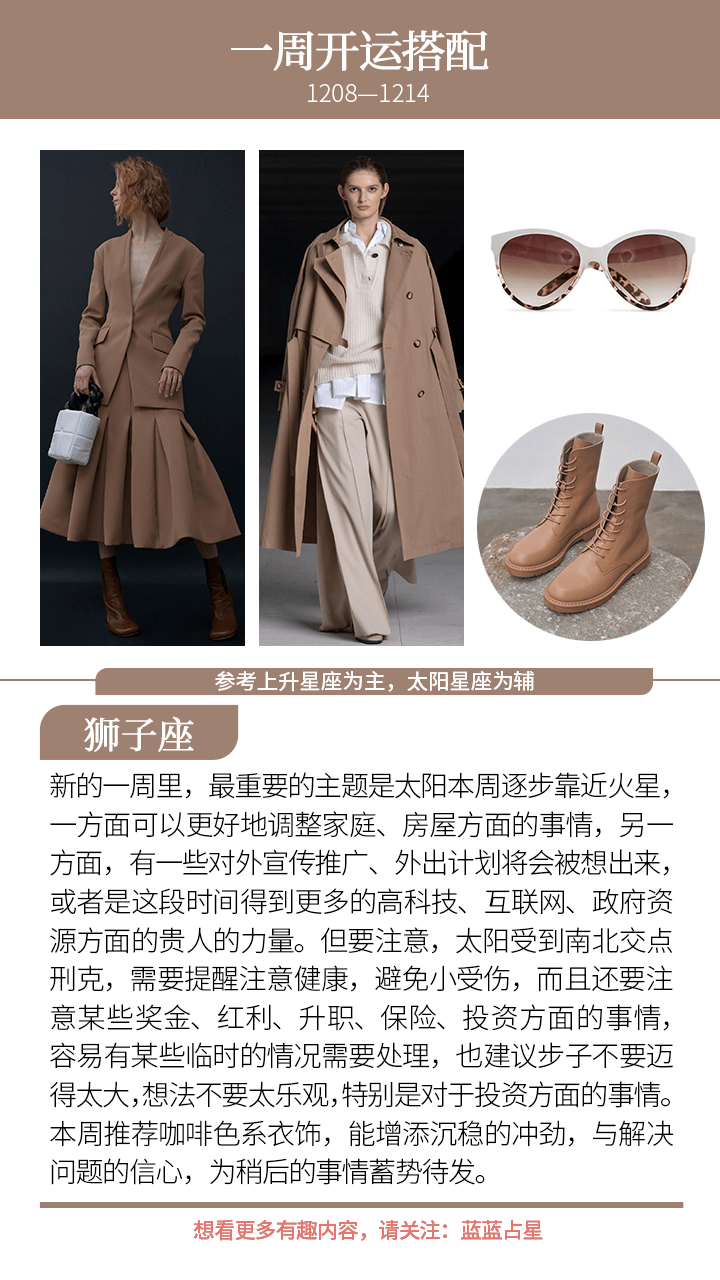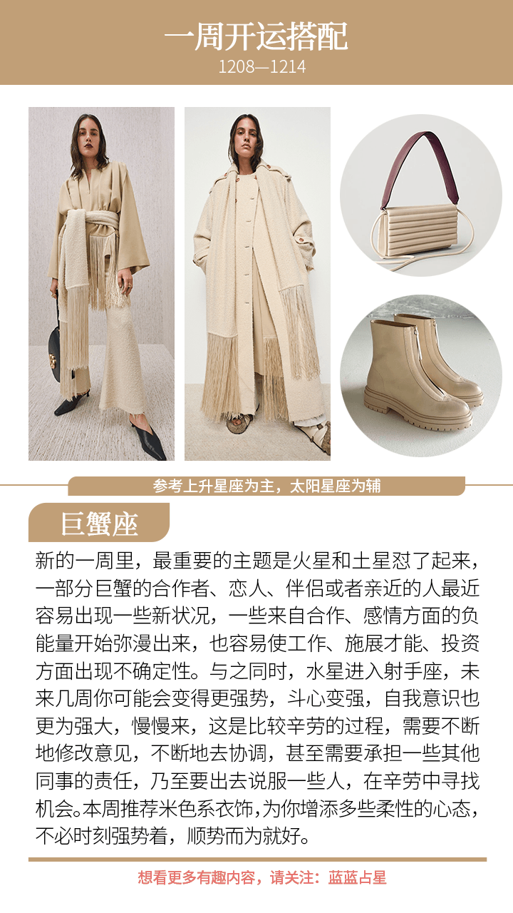 而对于(上升星座或太阳星座)狮子、巨蟹、金牛、天秤,你的合作者或者伴侣、恋人会出现额外需要你的情况,或者是他们出现情绪无常的情况,本周尽量独善其身,做好自己能做的,莫管太多他人是非和想法。