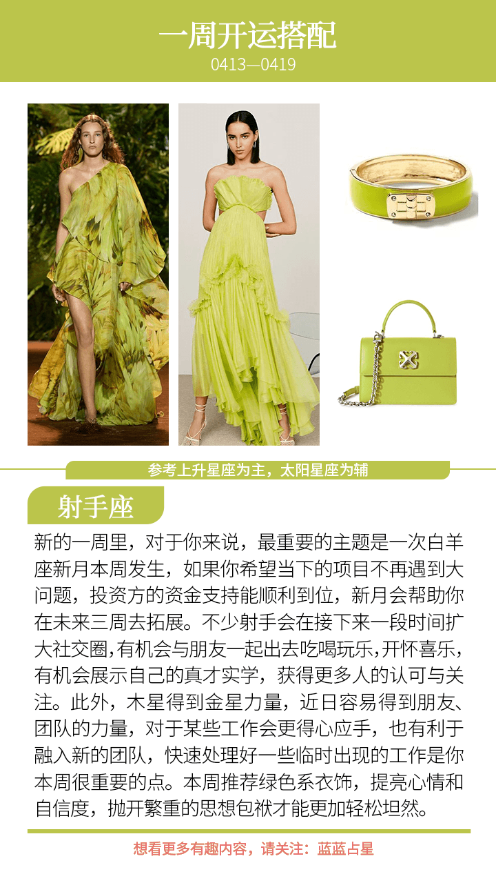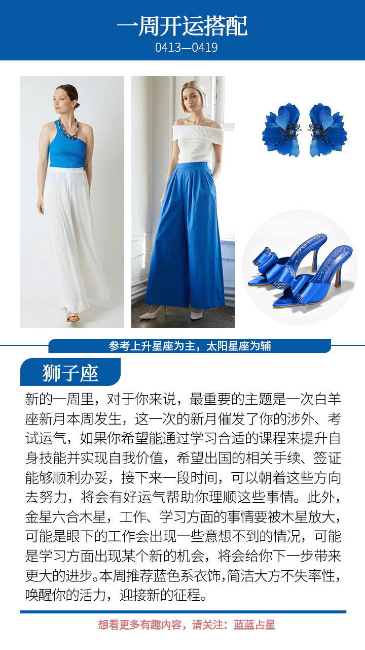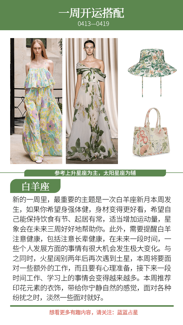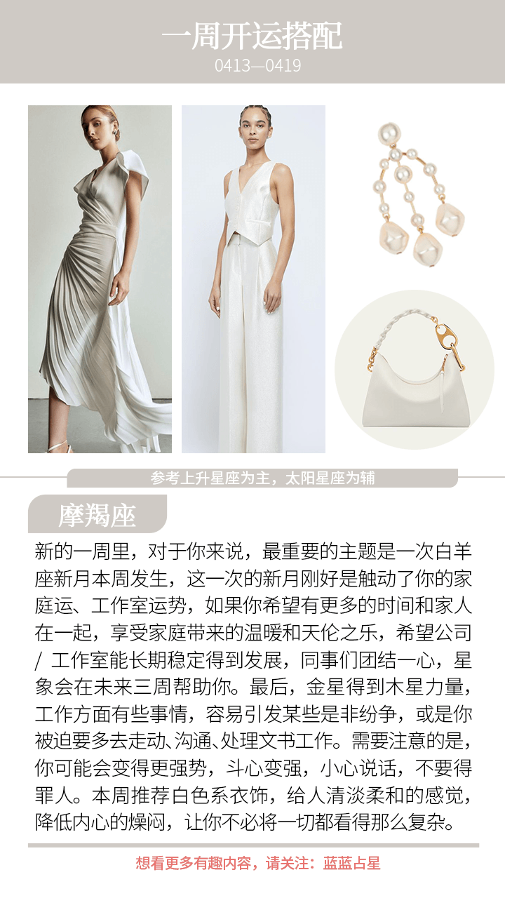 最后,一次白羊座新月本周发生,在这种力量的推动下,接下来几周,(上升星座或太阳星座)白羊、天秤会有新的合作关系、新的发展抉择,或者是健康方面暴露出问题而后得到治疗,又或者是感情方面会需要注意,容易有新的桃花机会或者是额外的烂桃花。而(上升星座或太阳星座)巨蟹则容易是工作、学习、母亲、钱财方面会有一些新的起步或者是进展;(上升星座或太阳星座)摩羯则要留意家庭、工作室方面,一些房子、长辈、家人方面的事情,迟点会延申出新的情况。