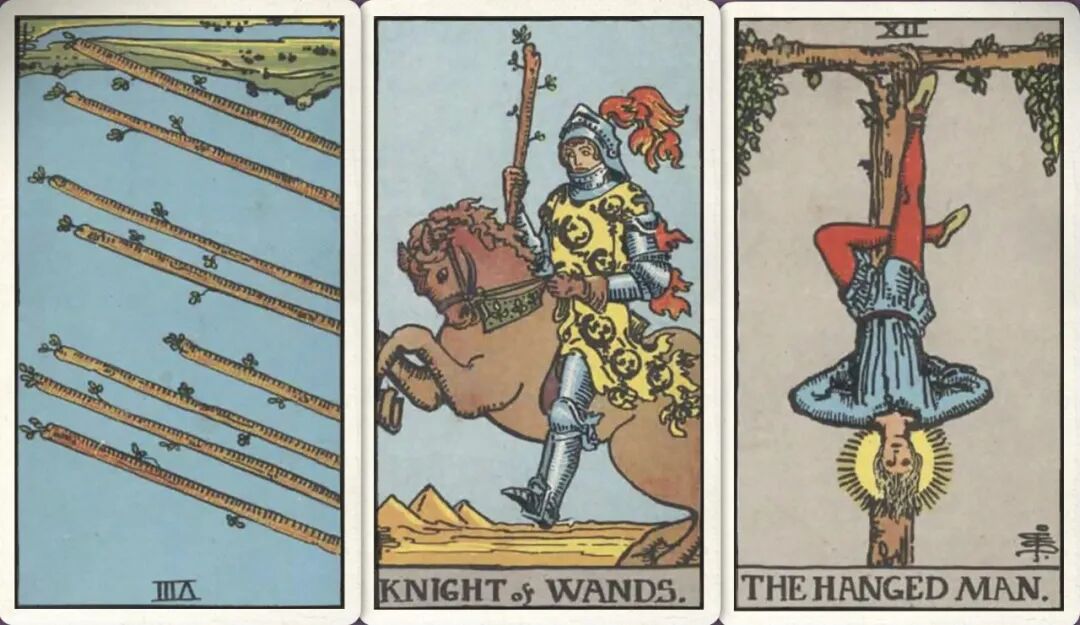 牌:权杖八- 权杖骑士+ 倒吊人+