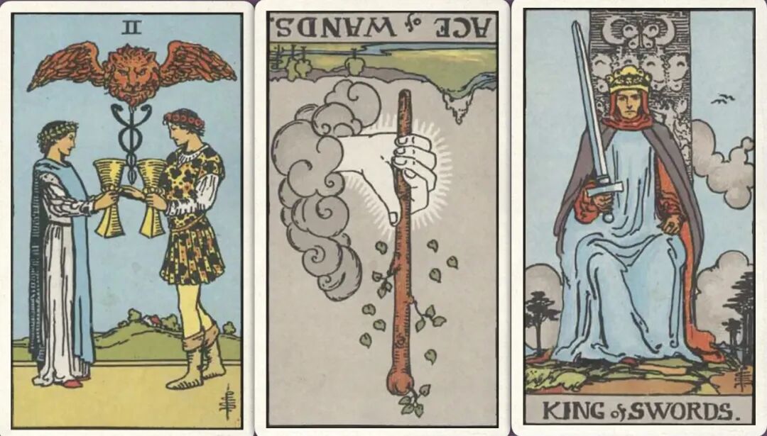 牌:圣杯二+ 权杖ace- 宝剑皇帝+