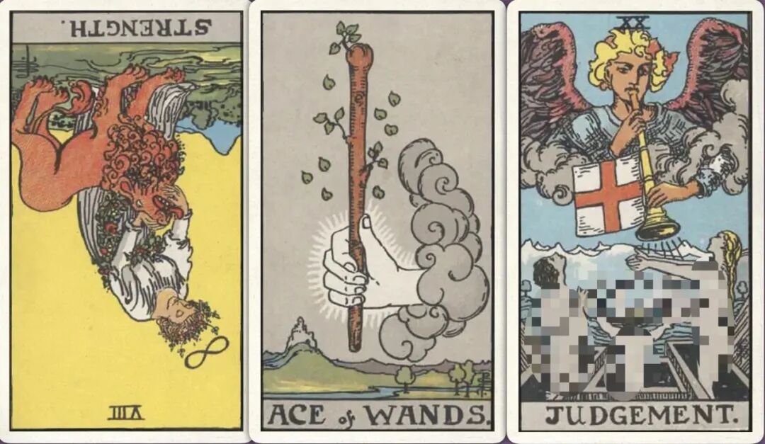 牌:力量- 权杖ace+ 审判+