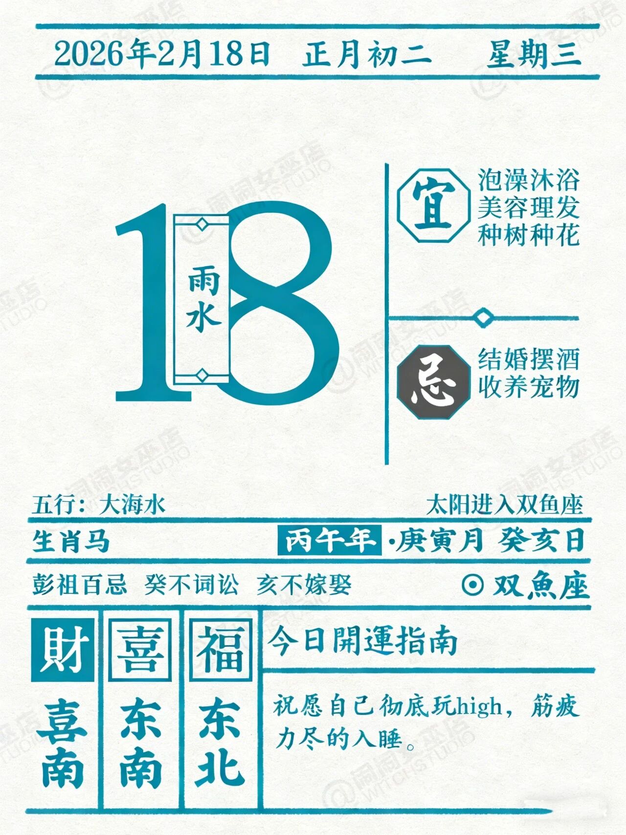 今日适合孕育灵感,积累有趣的故事。建议趁着脑筋清晰,想到什么好点子就赶紧记下来。如果有之前买过却还没有时间看的书、电影或短剧,今日可以拿出来读一读、看一看。一些颇具思辨的议题和跌宕的情节,都会让你耳目一新。