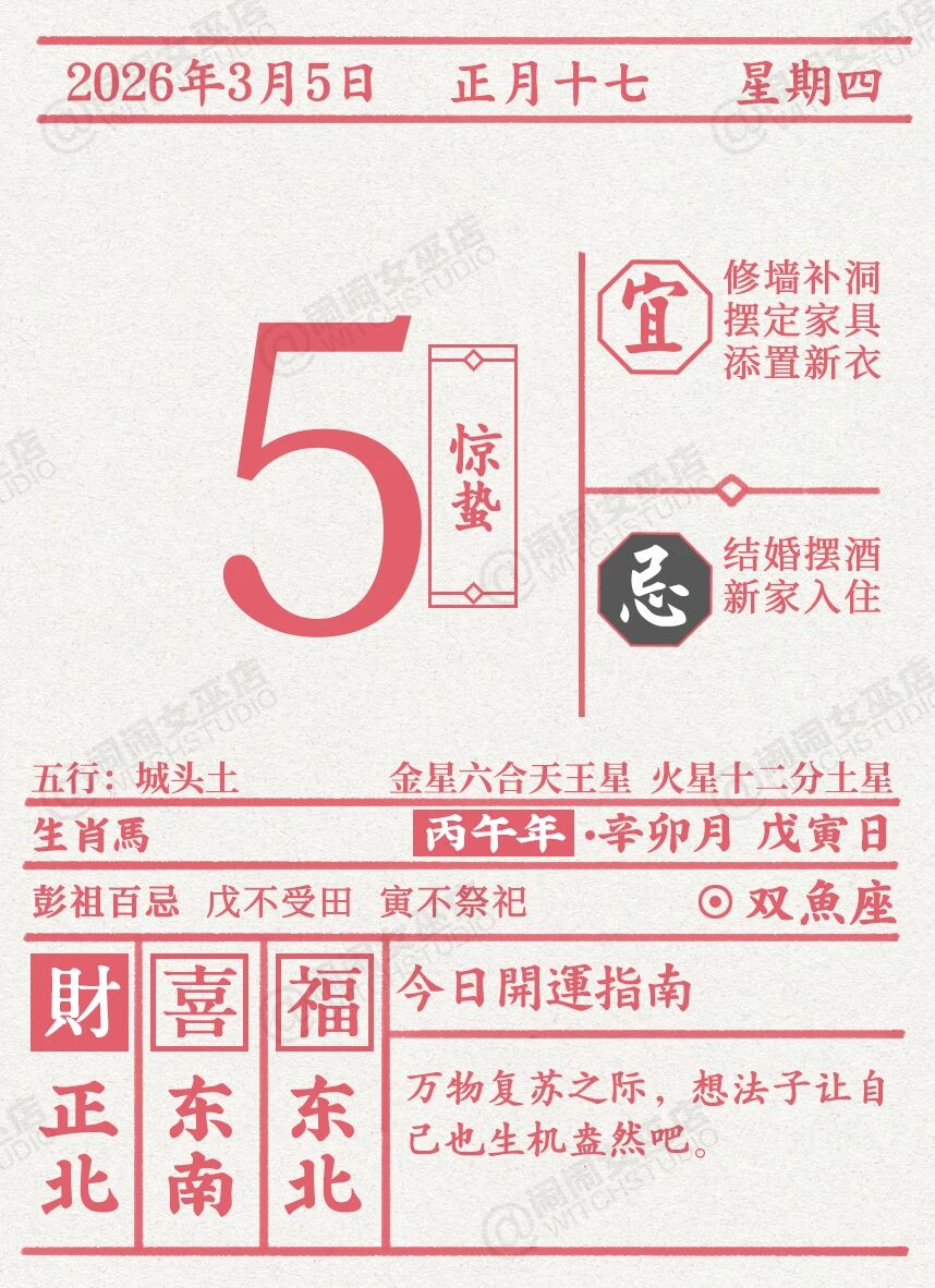 重新认识自己、重新出发的一天。今天你对过去的很多事情都会有总结性的感慨,当这些情感在思想上整理清楚时,你就会进入到重新出发,渴望新生的阶段。所以今天很适合整理过去,彻底断舍离,也适合做一些以前不敢做的事,或者开启事业新征程。