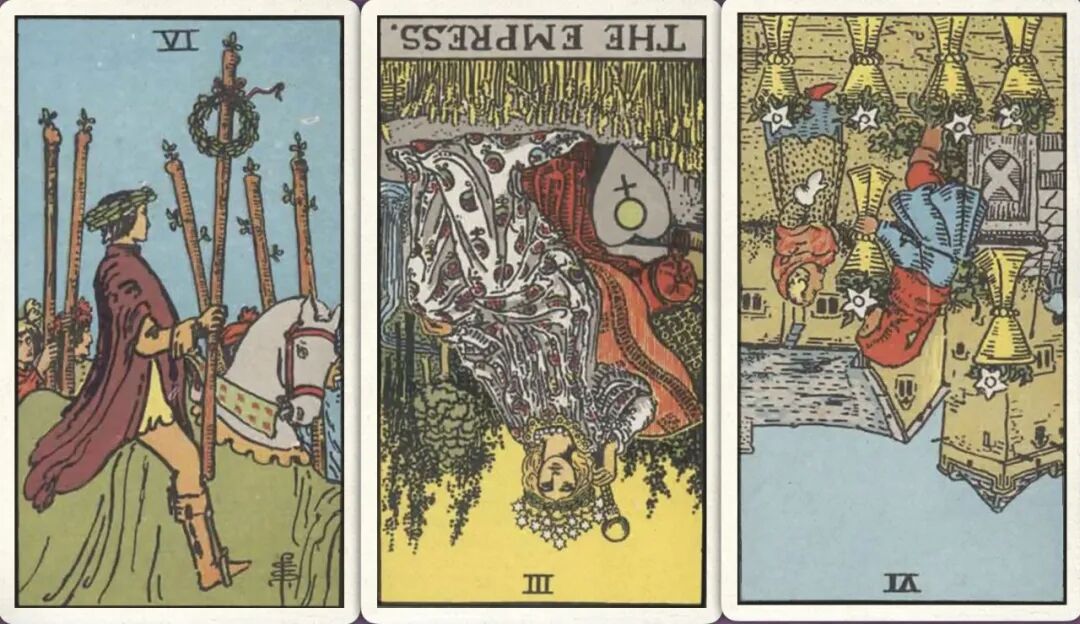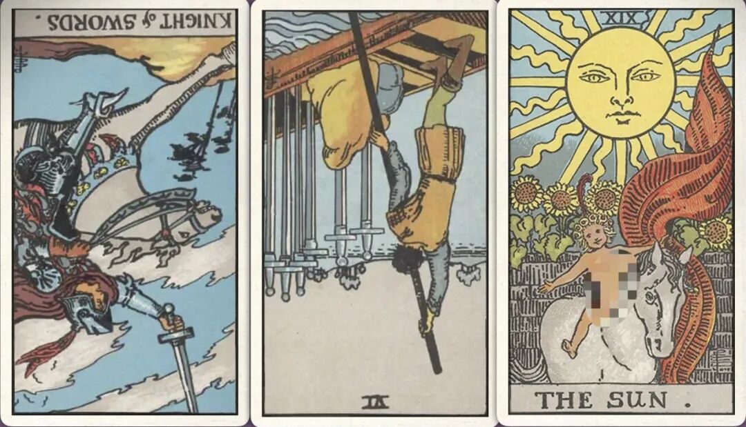 牌:命运之轮- 宝剑骑士+ 权杖七+