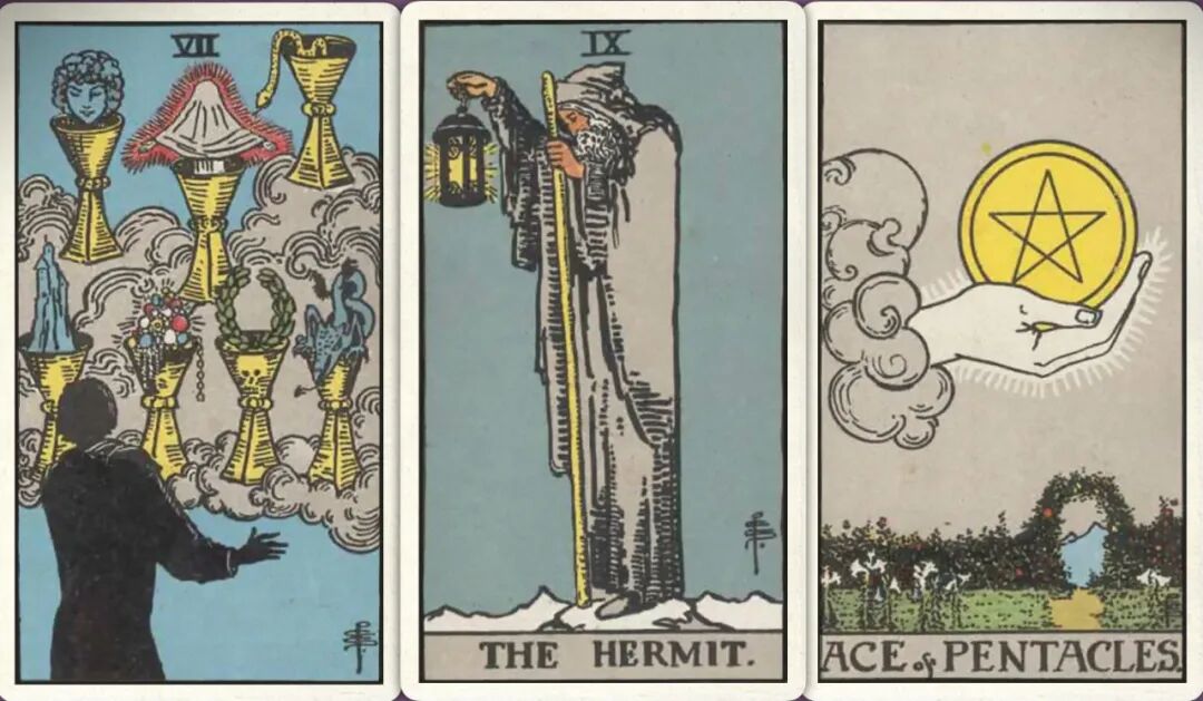 牌:圣杯七+ 隐士+ 星币ace+