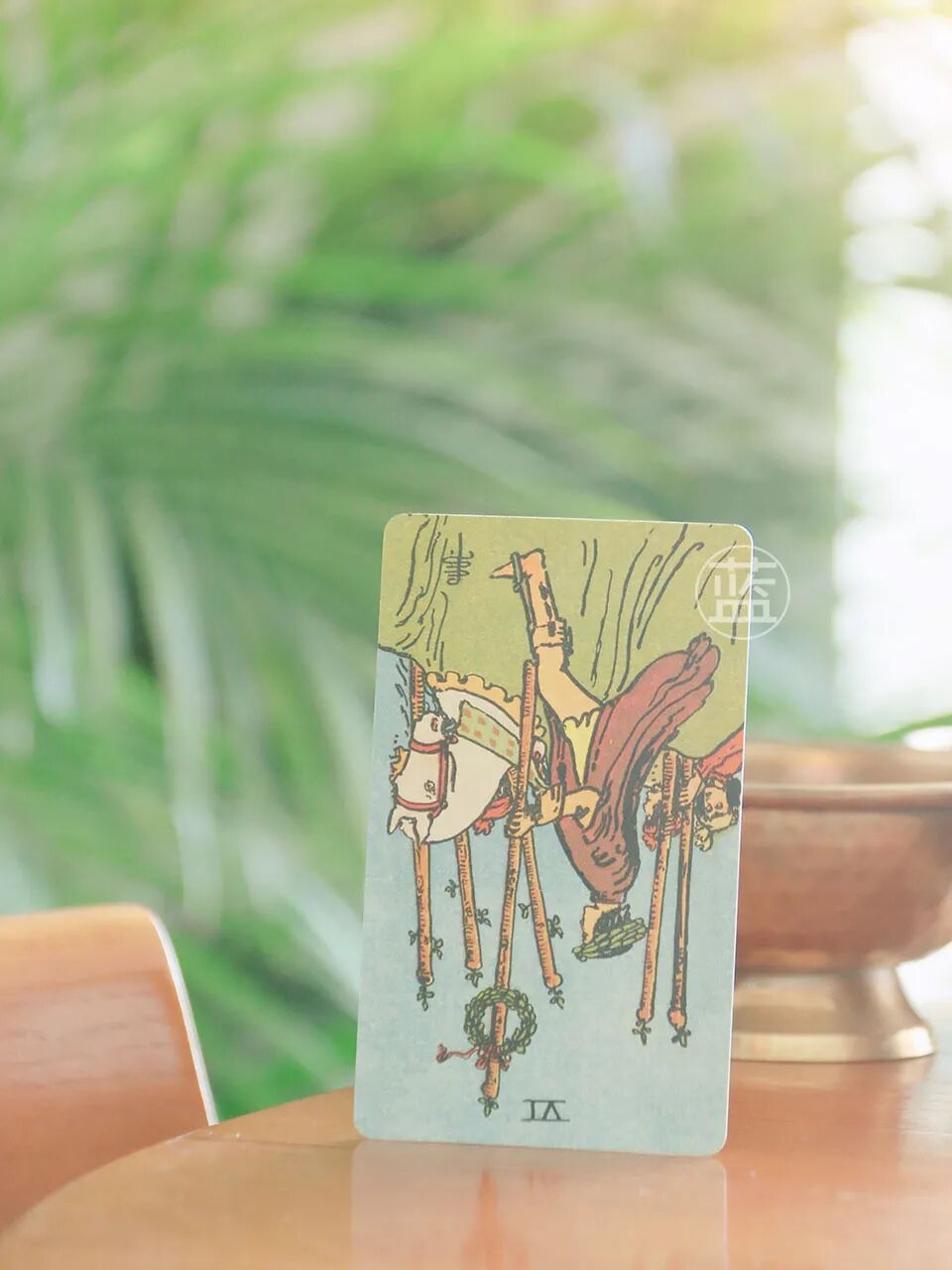权杖6暗示着成功或喜悦的自信,而逆位时则意味着消极情绪的滋生,或许是因为收到不好的消息,又或者自信心的缺失,亦或者自己的某些事情并不被大家看好,或是无法得到家人朋友的理解和支持等。