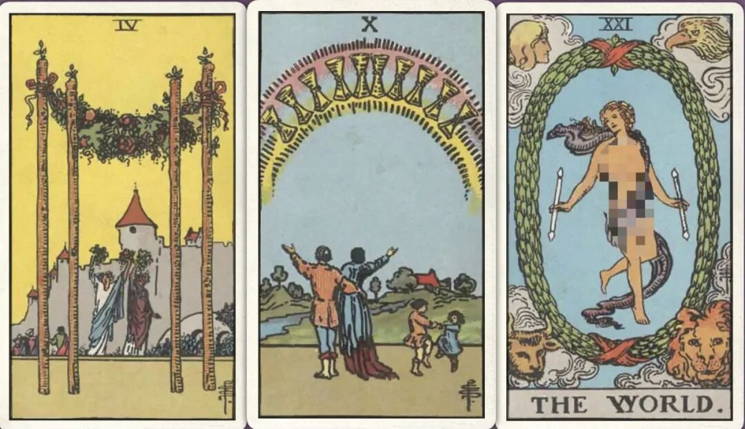 牌:权杖四+ 圣杯十+ 世界+