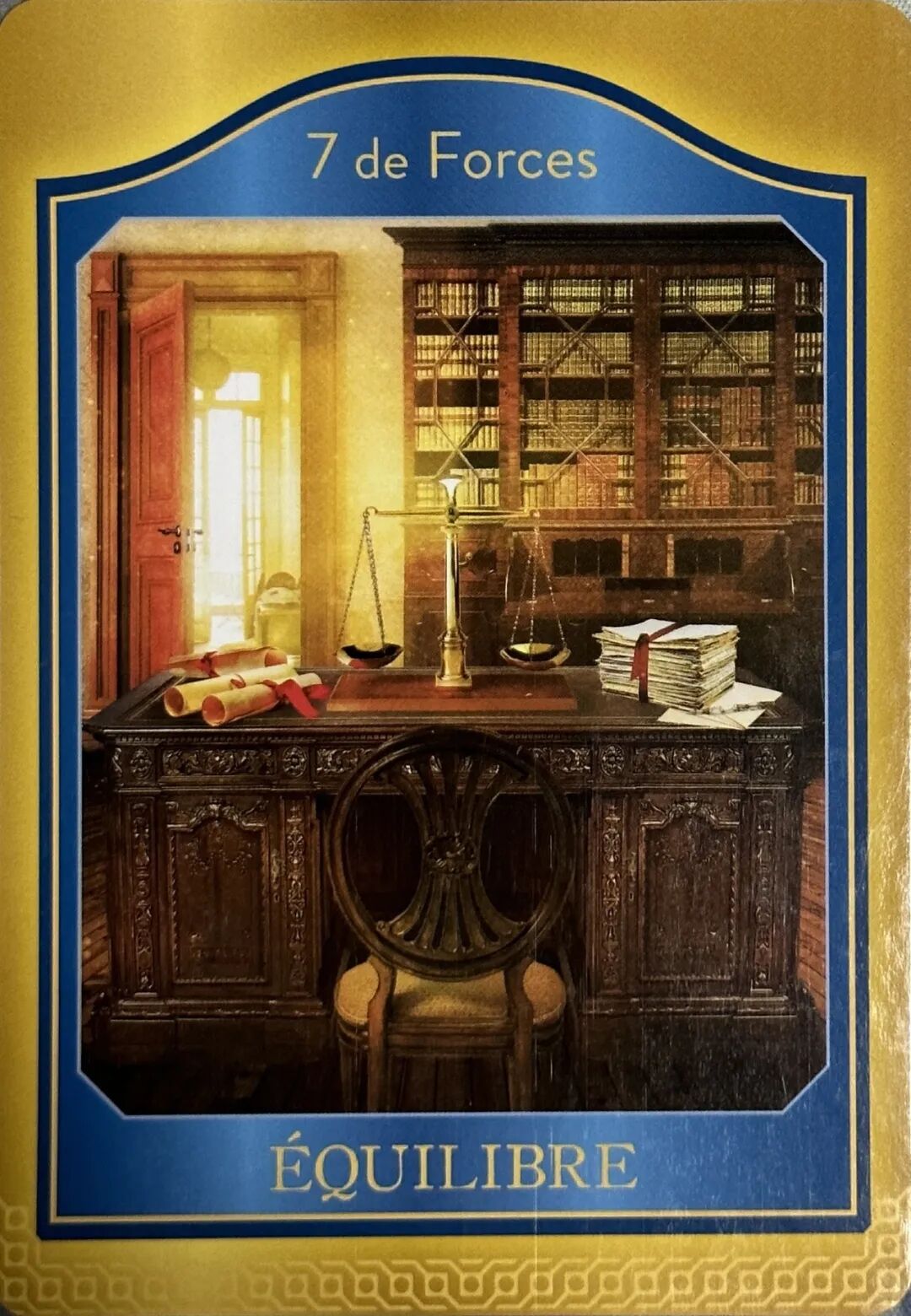 解析:牌面上是书房的场景,桌面上却有个平衡的天平,这提醒你,未来里要维系内心世界和物质世界的平衡,特别是工作中,有时候你的超负荷是会给你的心灵带来负担的,继续坚持,反而可能会事倍功半!所以,适当休息,疗养心灵很重要!